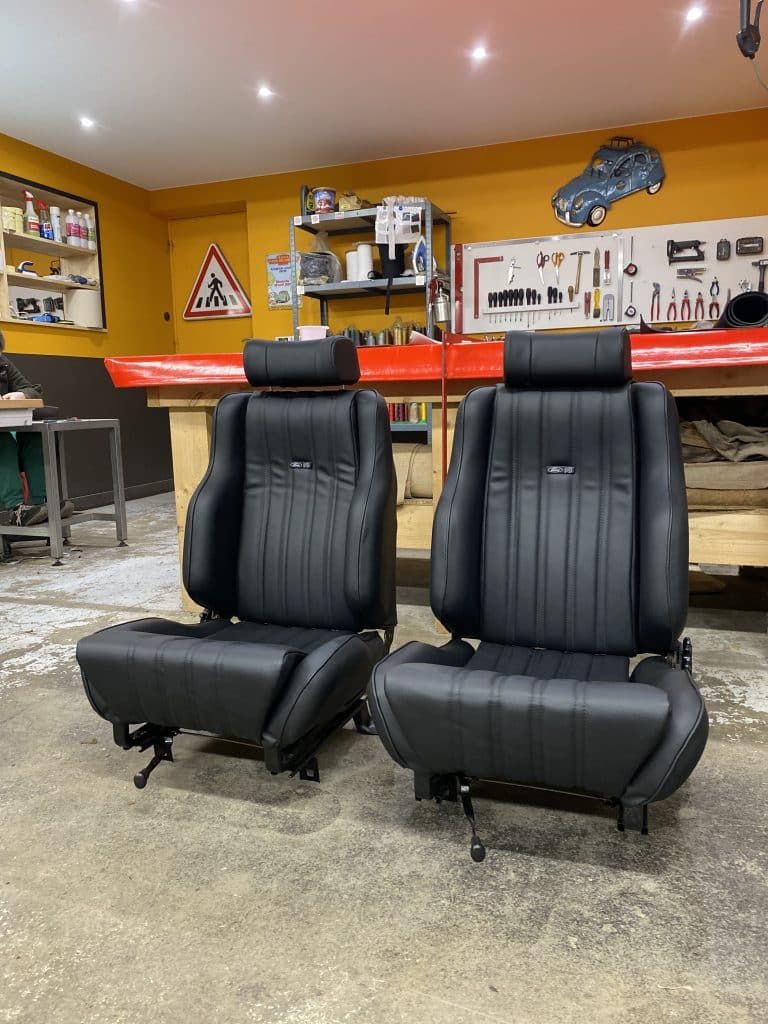 Notre client désirait garder l’esprit d’origine avec un tissu de couleur « mauve-marron ». Hélas, nous n’avions rien qui correspondait réellement. Alors nous sommes partis sur une valeur sûre: le revêtement « Olympia » noir.